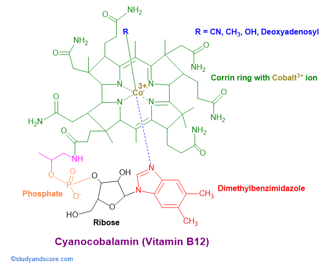 Though the corrin ring is similar to the porphyrin ring of chlorophyll and cytochrome, it has two directly boned pyrrole rings. The central atom in the corrin ring is Cobalt. Four of the six coordinations are provided by the corrin ring nitrogen atoms. Fifth coordination is provided by dimethylbenzimidazole group. The sixth coordination partner is a cyano group (-CN), a hydroxyl group (-OH), a methyl group (-CH₃) / 5'-deoxyadenosyl group respectively. The covalent C-Co bond is the only carbon-metal bond known in biology.