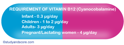 The estimation for the requirement of vitamin B12 requirement is based on its amounts required to maintain normal RBC maturation in patients with pernicious anemia. It is secreted in bile and reabsorbed in small intestine.