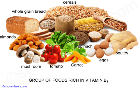 The meat group especially organ meats and poultry, is the chief source of preformed niacin. Dark green leafy vegetables, whole grain, enriched breads and cereals are fair sources. Other sources of Vitamin B3 include Avocado, Spinach, Tomatoes, mushrooms and carrots.