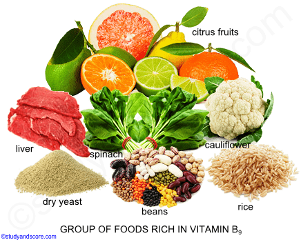 Folic acid is particularly present in Beans, Legumes, Cereals, Rice, Citrus fruit, Spinach, cauliflower and dried yeast. Egg, liver and kidneys are rich animal sources.